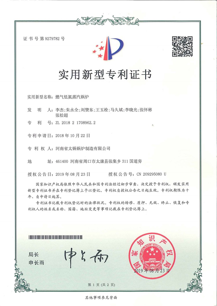 • 燃氣低氮蒸汽鍋爐專利